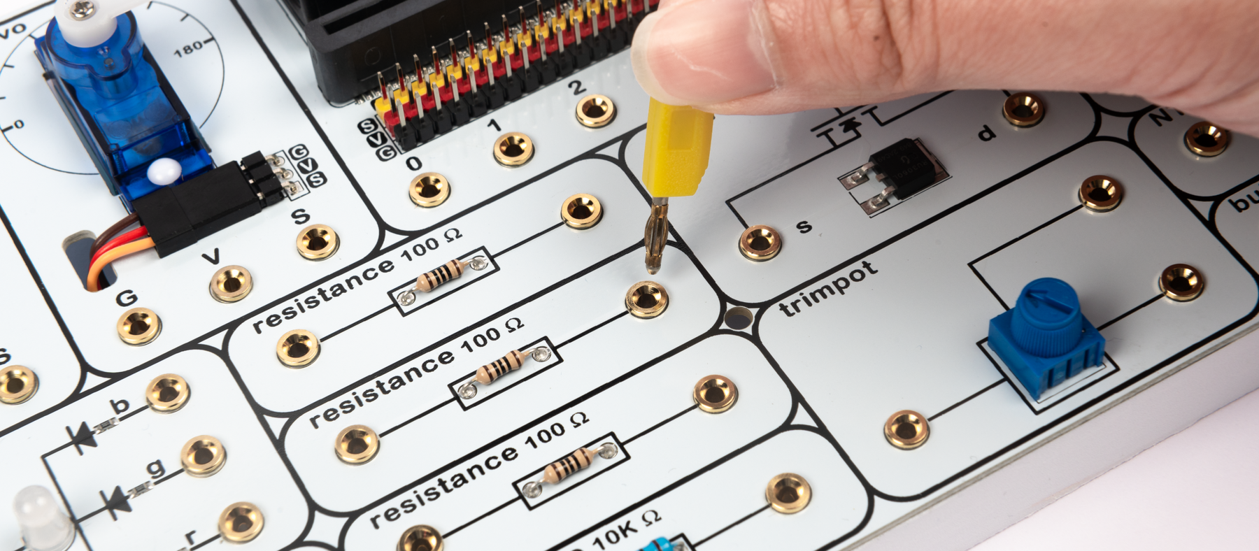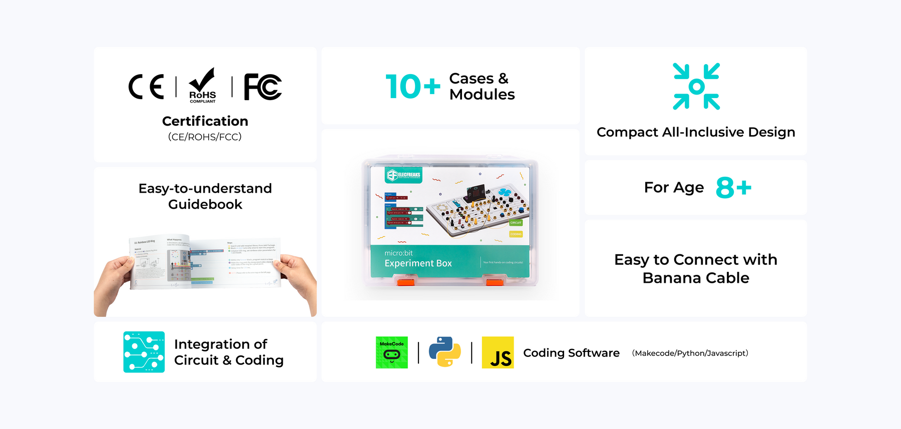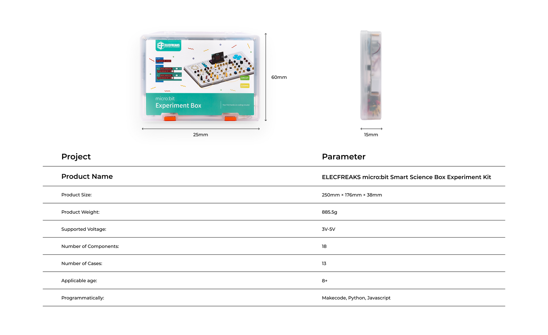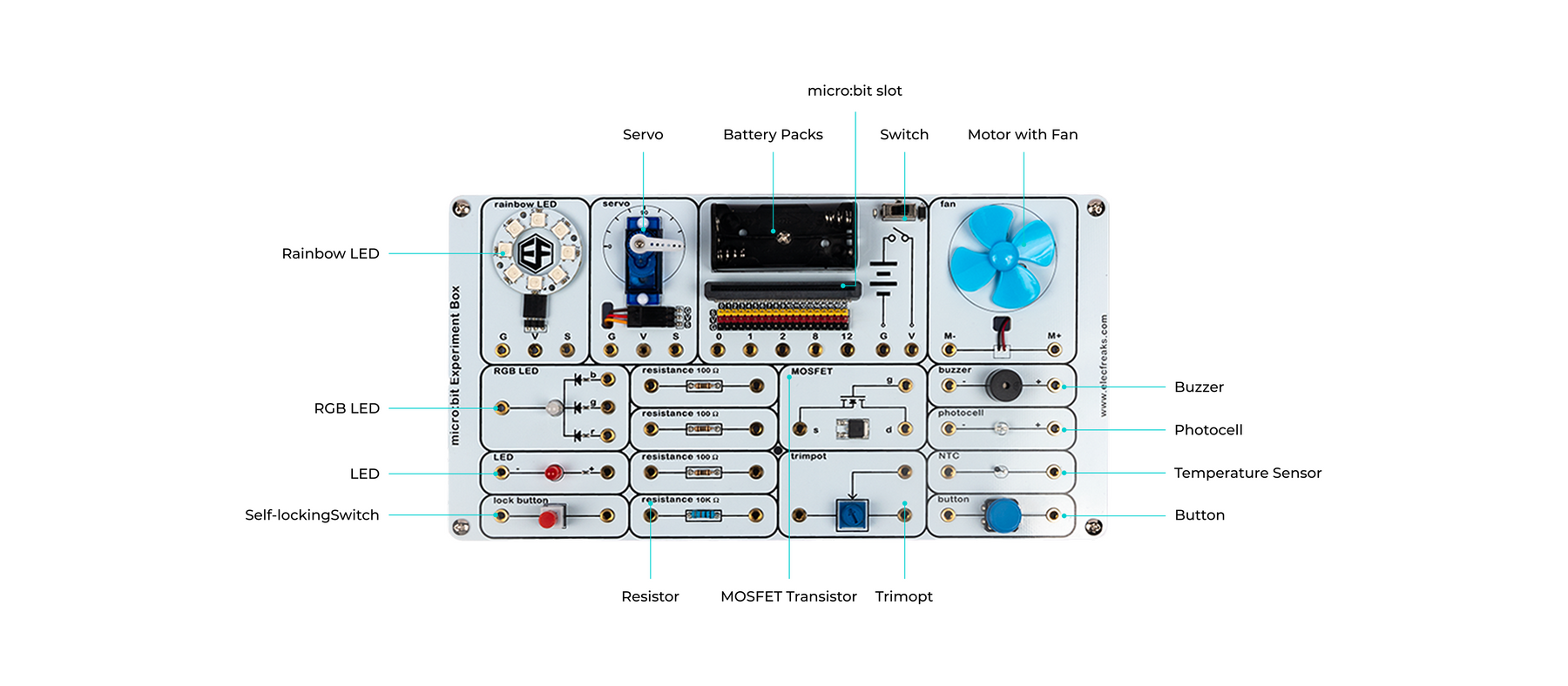Experimentálny box Elecfreaks je úplne nová učebná pomôcka vyvinutá spoločnosťou ELECFREAKS. Zahrnuli sme do nej tradičné komponenty, ako sú snímač teploty, fotobunka, servo, motor a LED diódy. Pridali sme však aj elektronické súčiastky, ako je tranzistor MOSFET, rôzne hodnoty rezistorov a trimpot, aby sme spojili návrh obvodu s programovaním.