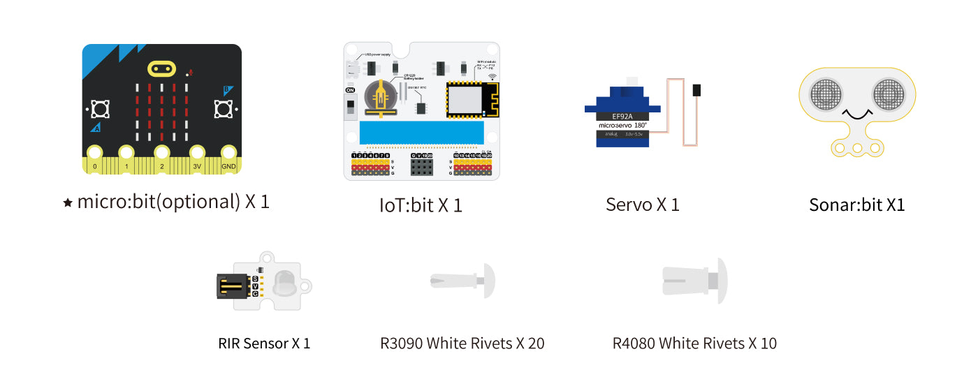 ELECFREAKS Classroom Smart Pet Feeder Kit uses a micro:bit v2, an IOT:bit expansion board, a PIR sensor from the Octopus series as well as a Sonar:bit, a 180° 9g servo, and a cute little wooden house as components.