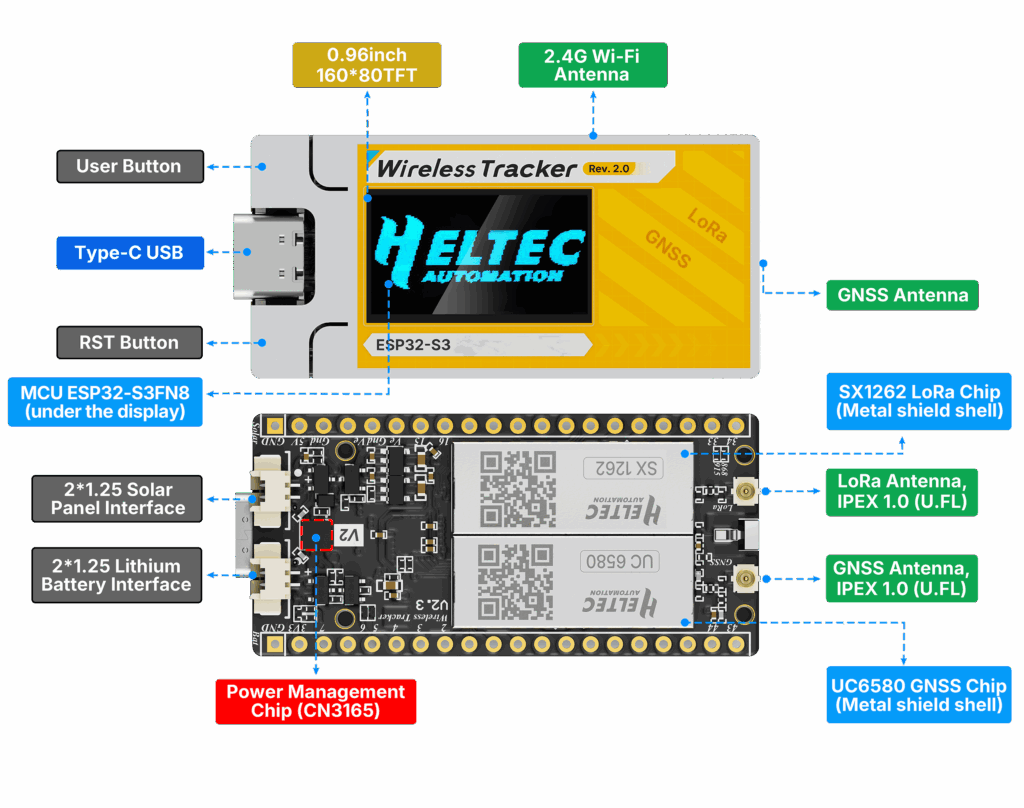 Bezdrôtový tracker V2, poháňaný čipom ESP32-S3FN8, integruje čipy SX1262 a UC6580 na podporu technológií WiFi, Bluetooth, LoRa a GNSS. Vďaka zabudovanému zosilňovaču poskytuje vysielací výkon 28 ± 1 dBm.